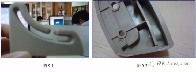 在這里制品仍做了1.2MM的反變形,澆口由原來的牛角進膠改為現在的大水口搭底進膠,分流道改為了S形,可防止主流道及分流道 的冷料進入模腔。實際的試模產品如圖9-1、9-2所示,產品無變形