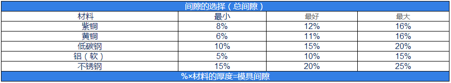 請(qǐng)參照下表選擇模具間隙(表中數(shù)據(jù)為百分?jǐn)?shù))